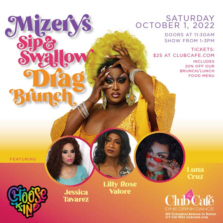 MIZERY’S SIP & SWALLOW DRAG BRUNCH featuring JESSICA TAVAREZ, LILLY ROSE VALORE. LUNA CRUZ. $25 includes 20% off our Brunch / Lunch food menu. Doors at 11:30am, show 1-3pm.