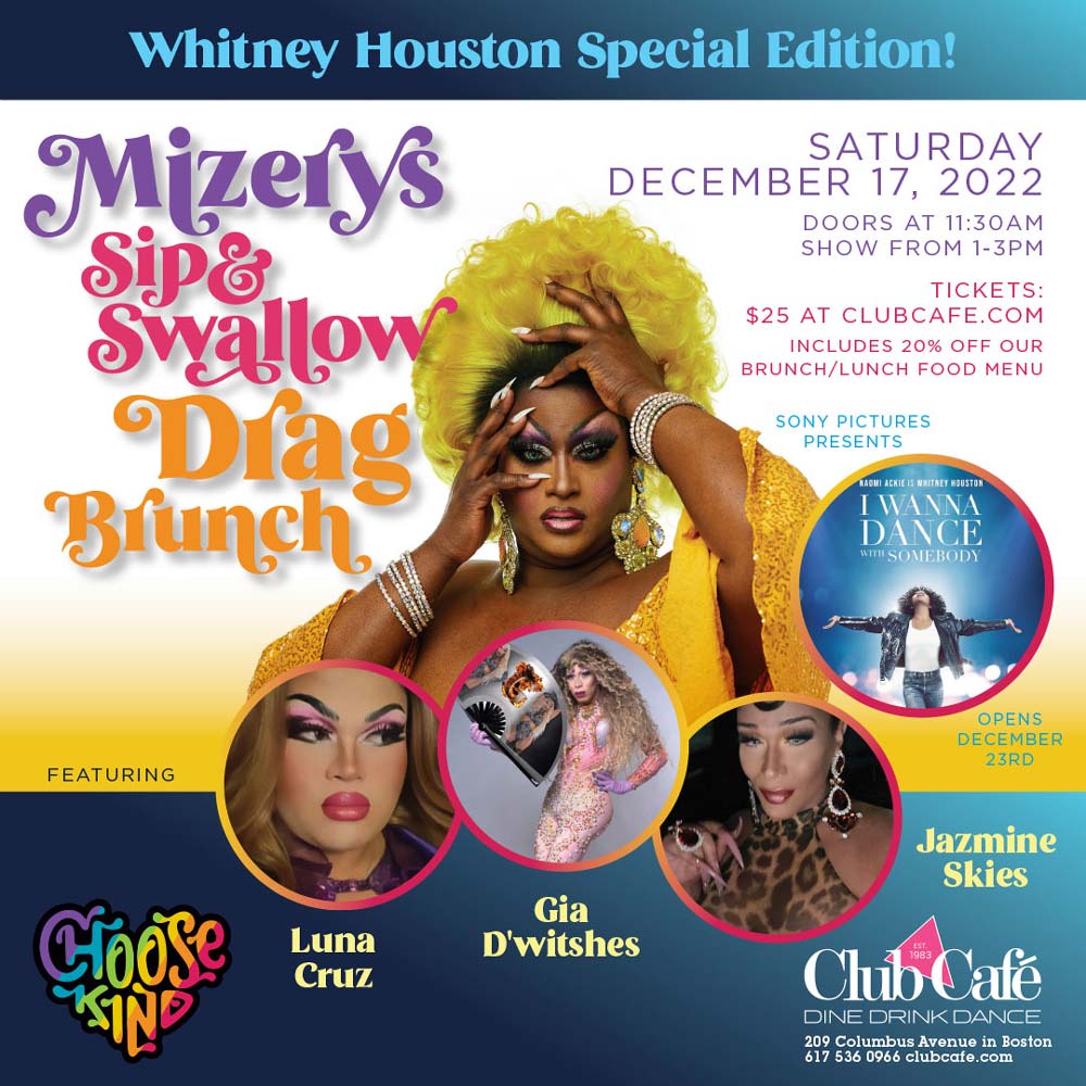MIZERY’S SIP & SWALLOW DRAG BRUNCH featuring Luna Cruz, Gia D’witshes, Jazmine Skies. $25 includes 20% off our Brunch / Lunch food menu. Doors at 11:30am, show 1-3pm.
