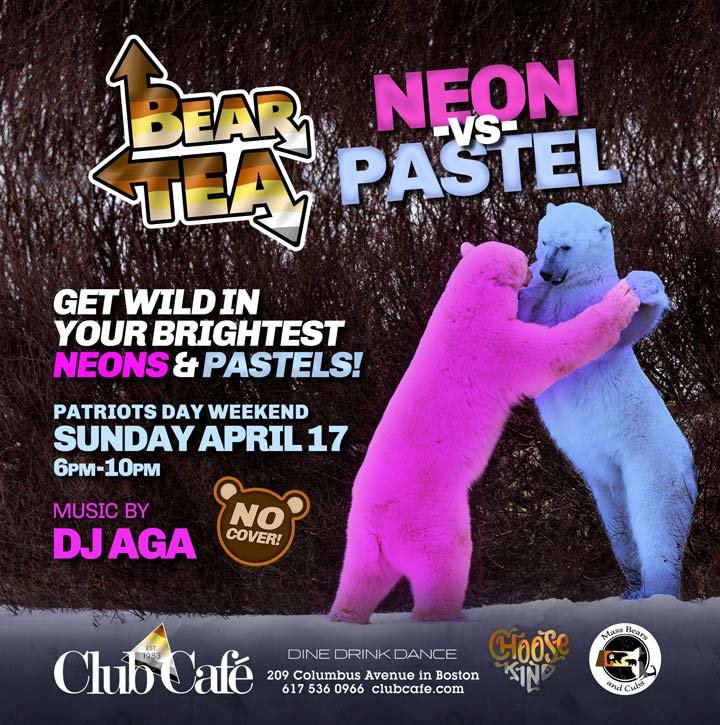 NEON VS PASTEL/strong> – Music by DJ AGA. Get wild in your brightest neons and pastels! Club Café welcomes the Bear and Otter community on the 3rd Sunday every month. No Cover.