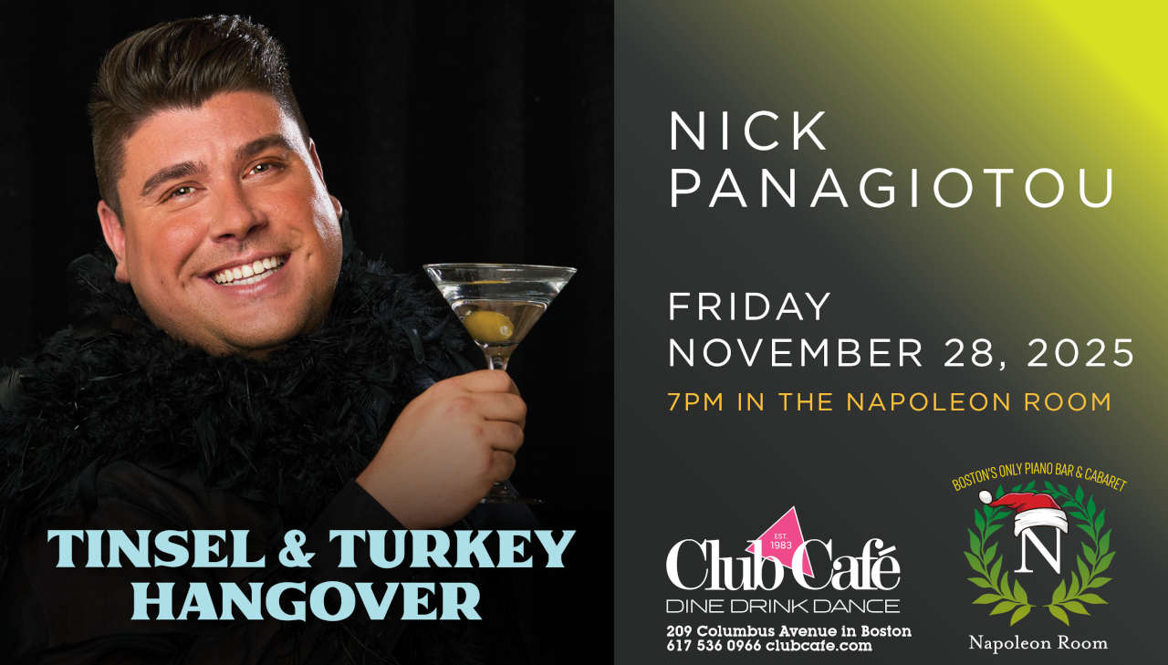 TINSEL & TURKEY HANGOVER – Nick Panagiotou brings a rich blend of charm, storytelling, and vocal warmth to the Napoleon Room. A Boston-based performer with over 30 years of experience, Nick’s repertoire spans showtunes, jazz standards, and reimagined pop. He’s a longtime soloist with the Boston Gay Men’s Chorus, performing at Symphony Hall and on international tours, and has wowed audiences in sold-out cabarets like One More Song, One More Story. Whether belting a Broadway anthem or crooning a late-night ballad, Nick creates a welcoming space where every song feels like a conversation—and every night, a little celebration. Learn more at thenickp.com.