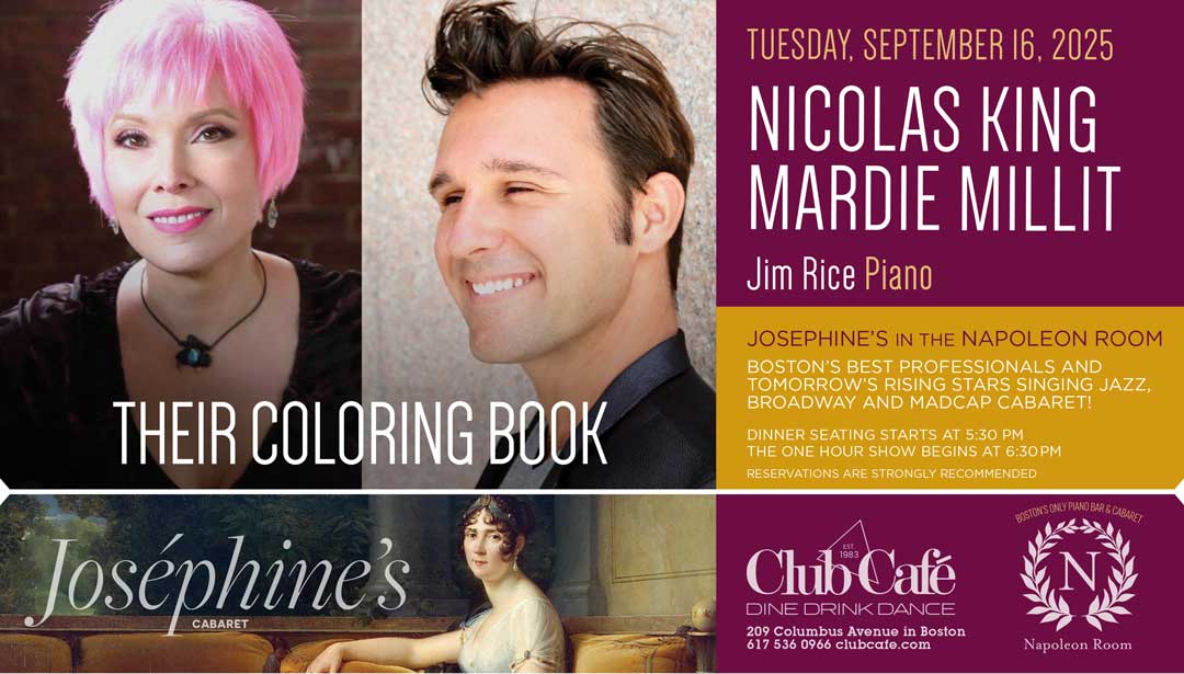 JOSEPHINE’S in the NAPOLEON ROOM – Boston’s best professionals and tomorrow’s rising stars singing JAZZ, BROADWAY & MADCAP CABARET! Dinner seating starts at 5:30 pm and the one hour show begins at 6:30 pm. RESERVATIONS strongly recommended.