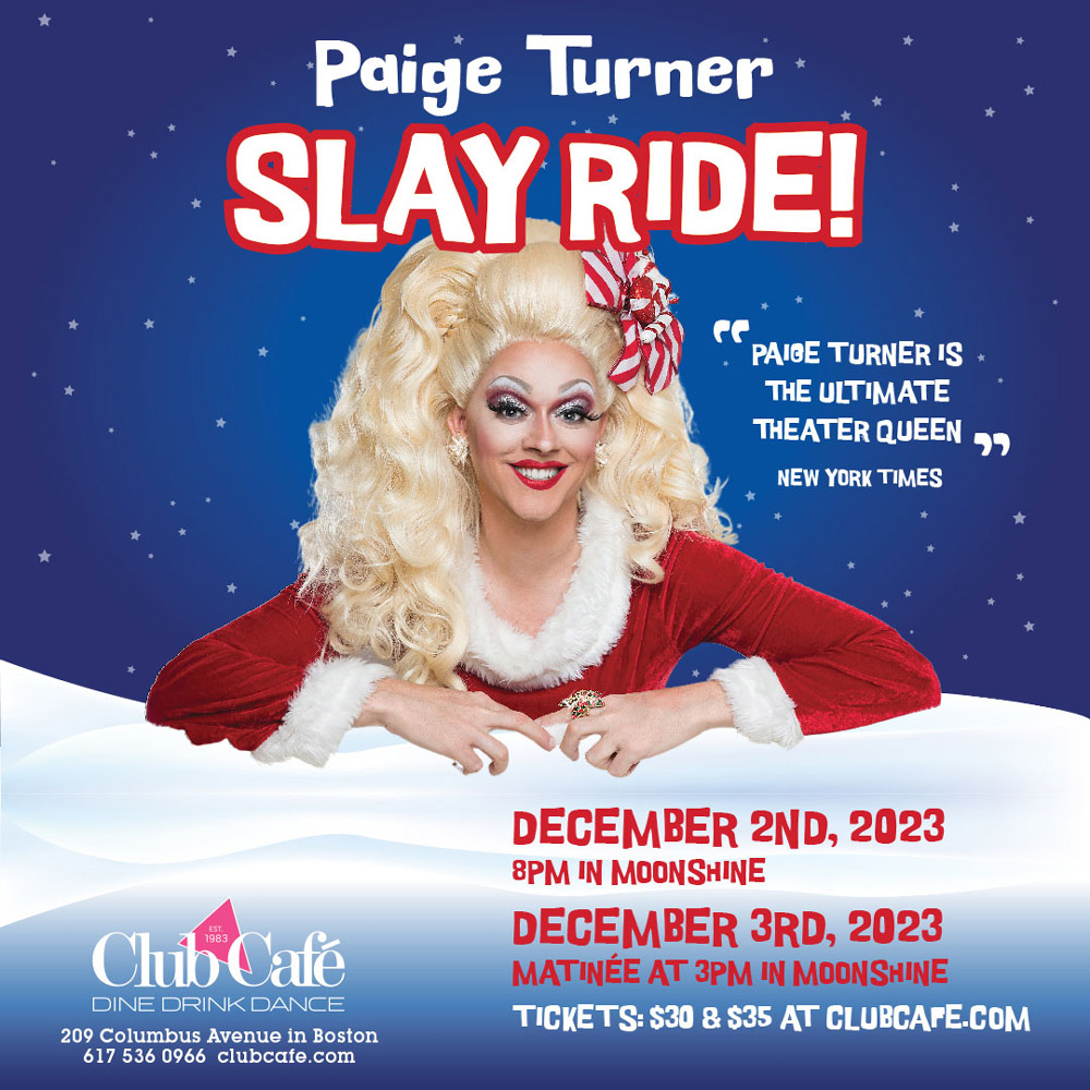 PAIGE TURNER returns by popular demand to CLUB CAFÉ in her all new holiday special “SLAY RIDE!” This oversized Barbie wants alot this Christmas and isn’t taking NO for an answer! Tis the season to be greedy, be a mistfit and get your stocking stuffed, while celebrating the true meaning of Christmas Paige Turner style. This holly jolly evening of mayhem and foolishness will definitely put you in the holiday spirit! The show features ALL LIVE sung songs from some of your favorite Christmas albums including Bing Crosby, Barbara Streisand and Mariah Carey. Original music as well over the top parodies of Feliz Navidad, I Want a Hippopotamus for Christmas and many more with videos and lots of presents just waiting to be unwrapped! *this show sold out last year, so plan ahead!