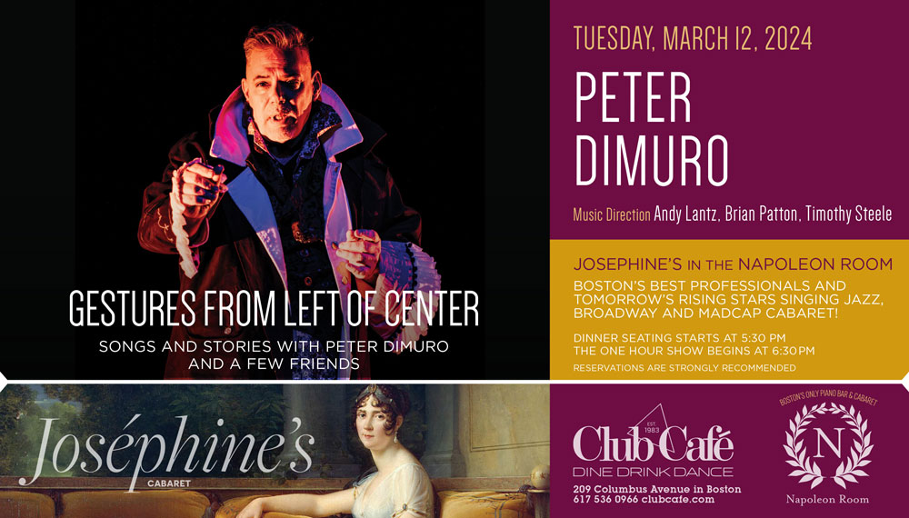 JOSEPHINE’S in the NAPOLEON ROOM – Boston’s best professionals and tomorrow’s rising stars singing JAZZ, BROADWAY & MADCAP CABARET! Dinner seating starts at 5:30 pm and the one hour show begins at 6:30 pm. RESERVATIONS strongly recommended.