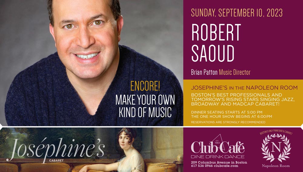 JOSEPHINE’S in the NAPOLEON ROOM – Boston’s best professionals and tomorrow’s rising stars singing JAZZ, BROADWAY & MADCAP CABARET! Dinner seating starts at 5:00 pm and the one hour show begins at 6:00 pm. RESERVATIONS strongly recommended.