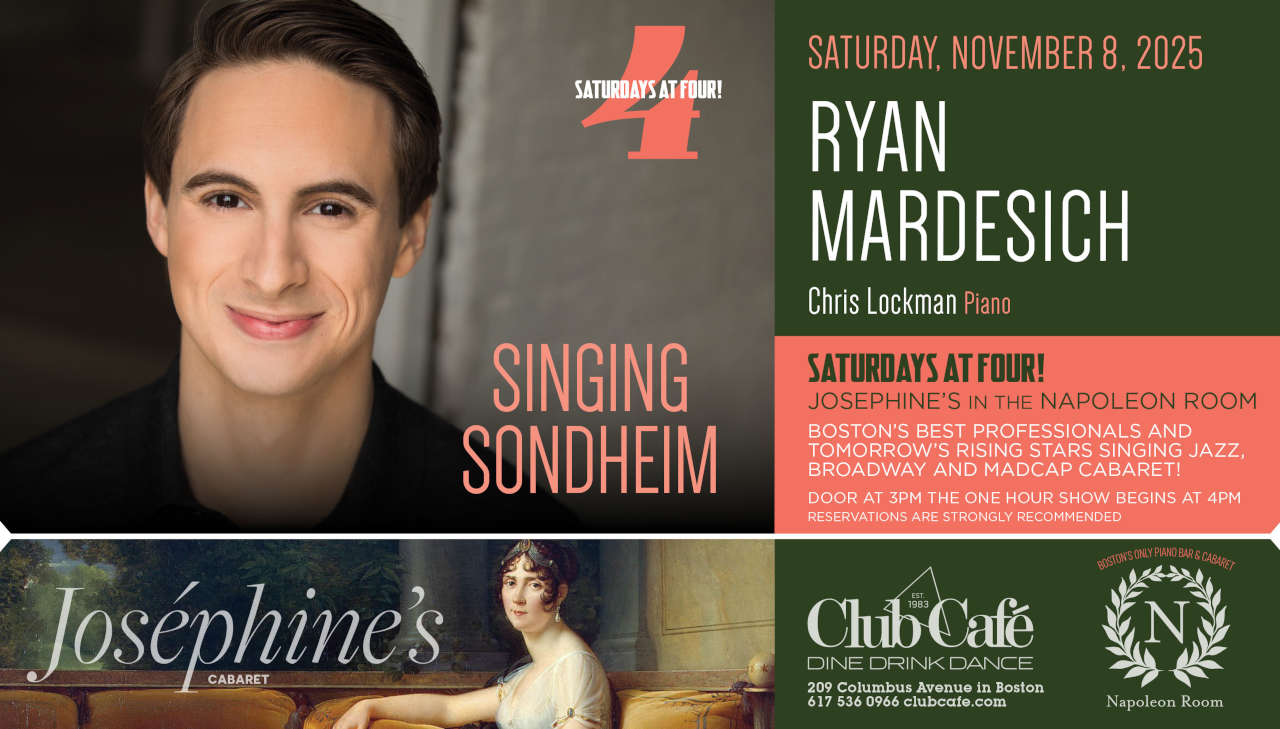 JOSEPHINE’S in the NAPOLEON ROOM – Boston’s best professionals and tomorrow’s rising stars singing JAZZ, BROADWAY & MADCAP CABARET! Doors open at 3pm and the one hour show begins at 4:00 pm. RESERVATIONS strongly recommended.
