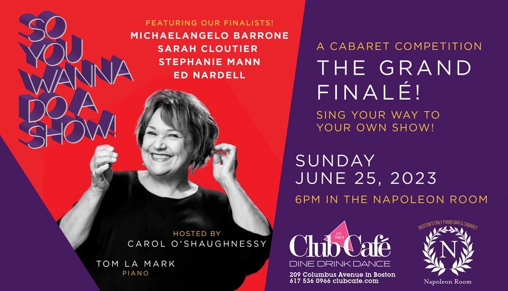Carol O’Shaughnessy returns with the SO YOU WANNA DO A SHOW finalists: Michaelangelo Barrone, Sarah Cloutier , Stephanie Mann, Ed Nardell. Come cheer on your favorite contestant and see who goes home with the grand prize of a night in The Napoleon Room!!