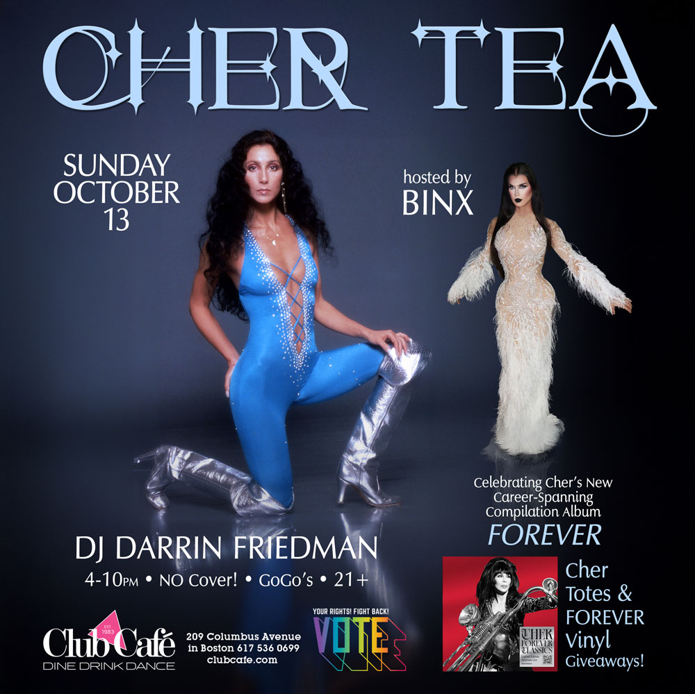 CHER TEA DANCE with DJ DARRIN FRIEDMAN – hosted by BINX! A Sunday Afternoon Dance Party celebrating Cher’s new career spanning compilation album FOREVER. 4pm-10pm. No Cover go-go’s – 21+.
