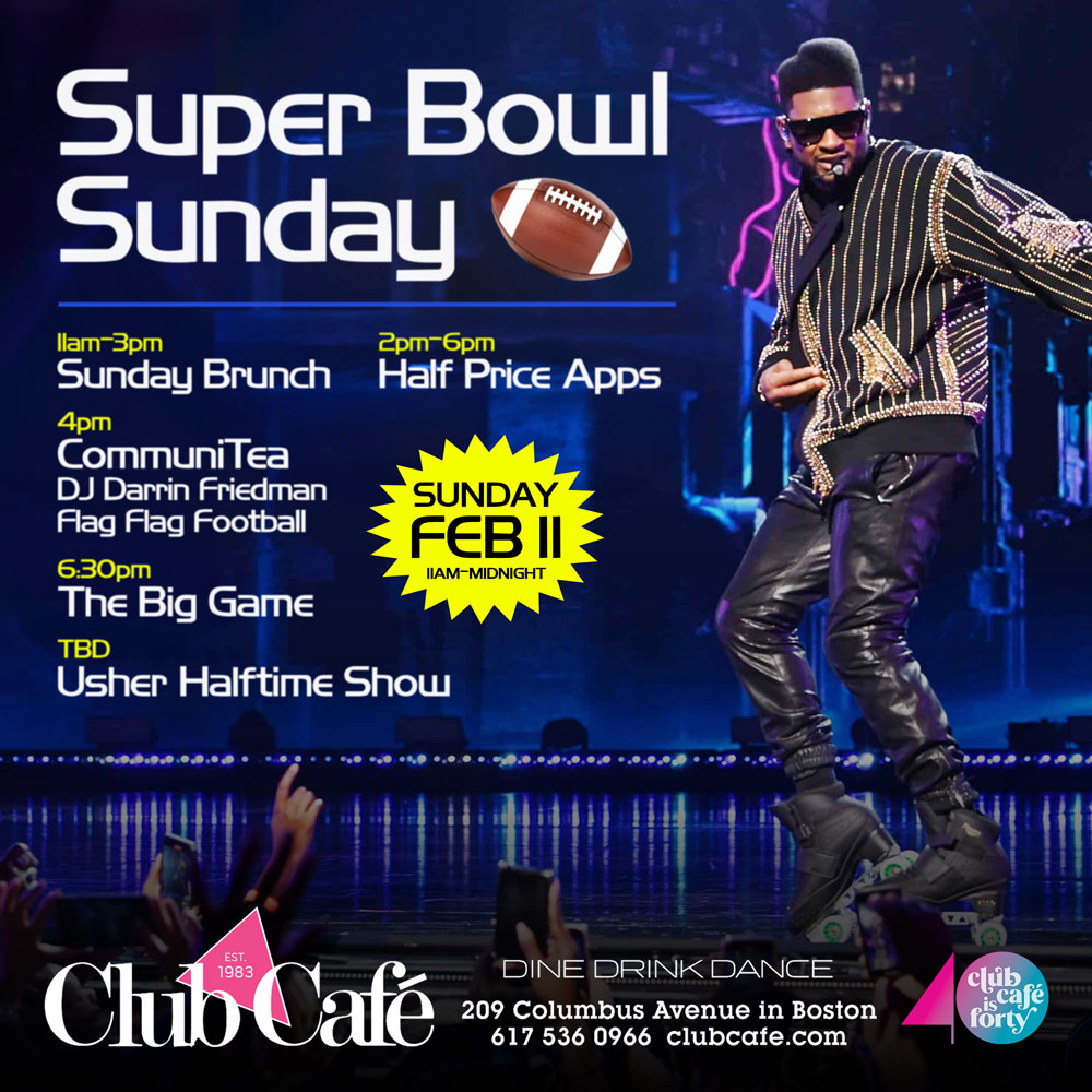 Home Events Super Bowl Sunday Super Bowl Sunday reservationsDine With Us. Date Feb 11 2024 Expired! Time 11:00 am - 11:55 pm Cost No Cover Location Club Café Boston 209 Columbus Avenue, Boston, MA 02116 Website https://www.clubcafe.com/ Location 2 Moonshine Room 209 Columbus Avenue, Boston, MA 02116 Location 3 Napoleon Room 209 Columbus Avenue, Boston, MA 02116 Category Featured Napoleon Feature Nightclub Feature Restaurant Feature Sunday