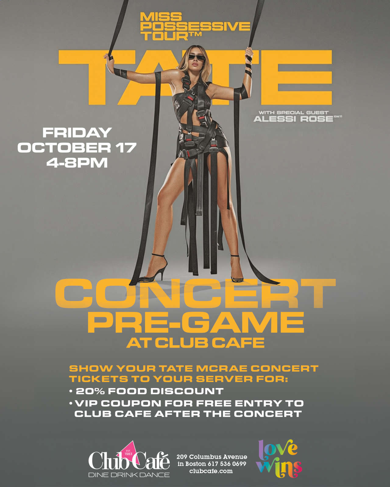 TATE MCRAE CONCERT PRE-PARTY. Show your Tate McRae concert tickets to your server for a 20% discount on your food. Includes a coupon for FREE entry to Club Café after the concert.