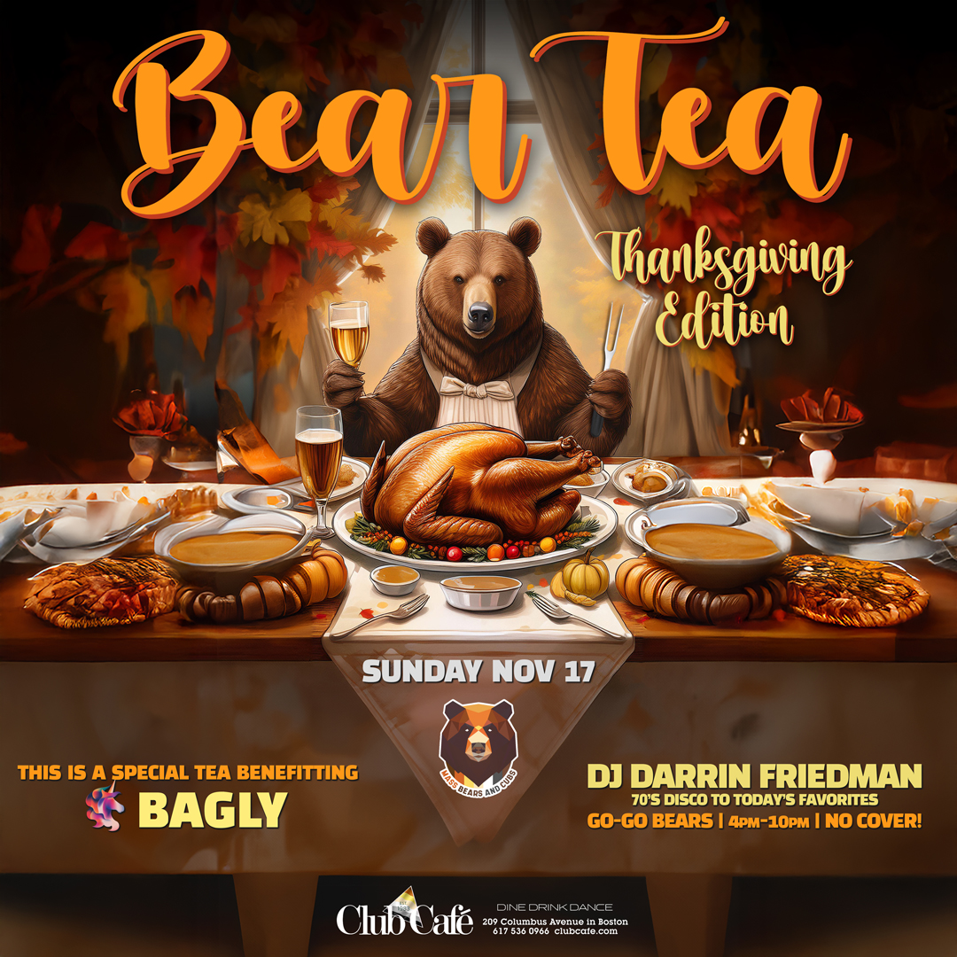 BEAR TEA – Thanksgiving Edition. Club Café welcomes the Bear and Otter community on the 3rd Sunday every month. Music by DJ DARRIN FRIEDMAN. No Cover. G0-G0 Bears – 21+