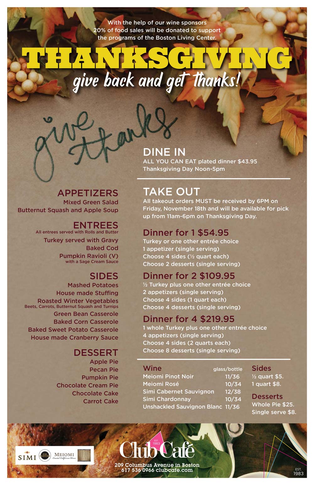 Give Back and Get Thanks! at Club Café Boston. ALL YOU CAN EAT PLATED DINNER $43.95 on Thanksgiving Day Noon – 5pm. DINE IN and TAKE OUT options.