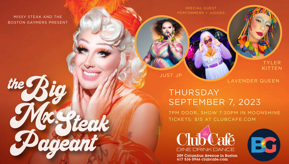 Missy Steak and the Boston Gaymers present, The BIG MX. STEAK PAGENT; an irreverent competition of wits, wigs and wrongs! 5 fine folks live their drag debut dreams and compete for the crown, sash, and title of the Big Mx. Steak! These drag virgins will be thrown straight into the fires of a Q&A in Swimsuits, a talent show, and a lipsync smack down finale two. They will be judged by special guest performers Just JP, Lavender Queen and the winner of the last Big Mx Steak, Tyler Kitten. This is a pag unlike any other; where mess can be success and perfection is out of the question. Come cheer, laugh, and discover the power of drag!