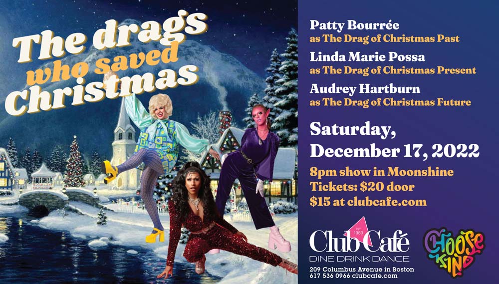 Global Warming! Disease! Elon Musk! Humanity has really screwed the pooch this holiday season, but luckily the Drags of Christmas Past, Present, and Future (Patty Bourrée, Linda Marie Possa, and Audrey Hartburn) are here to save the day—in the form of a delightful and seasonal drag cabaret, of course. Join this talented cast of Boston drag performers December 17th as they sing and dance their way out of the Apocalypse and into the Christmas Spirit in this one of kind drag experience.