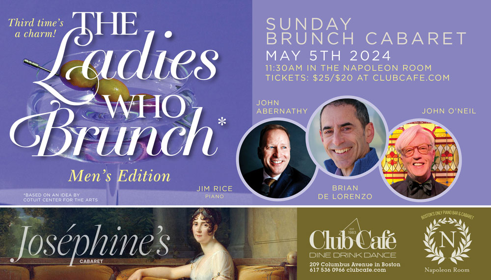 The Ladies Who Brunch at Club Café is Boston’s newest Sunday divertissement. After 2 sold out shows in March, THE LADIES WHO BRUNCH- Men’s Edition returns one more time with Abernathy, Brian De Lorenzo and John O’Neil. Don’t miss the cabaret show that people are crowing about. Tickets sold out fast for the previous shows so order early.