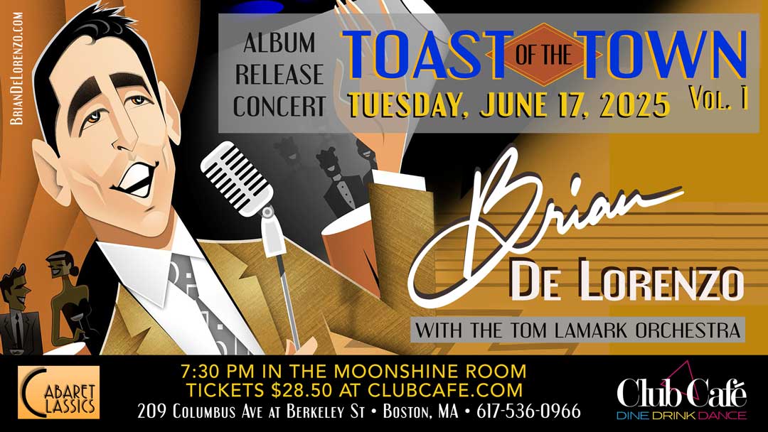 “Top Ten of New York Cabaret” and Talent America “Performer of the Year” BRIAN DE LORENZO performs songs from his latest recording, Toast of the Town Vol. 1, with the TOM LAMARK ORCHESTRA. The album includes “big band” numbers associated with the greatest singers of mid-century standards including Frank Sinatra; Sammy Davis, Jr.; Tony Bennett; Rosemary Clooney; Ella Fitzgerald; Judy Garland; and Steve Lawrence & Eydie Gorme.