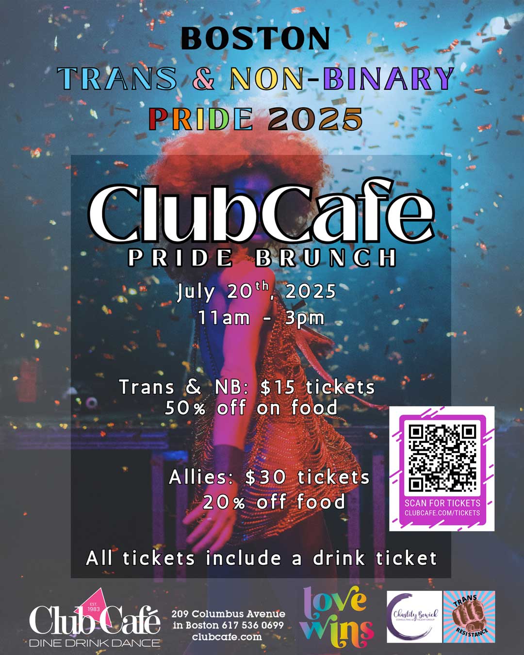 Celebrate Trans and Non-Binary Pride in the best way possible — with good food, great vibes, and even better company at Club Cafe’s Pride Brunch! This brunch is a bold and beautiful tribute to Trans and Non-Binary joy, resilience, and community. Whether you’re coming solo, with your chosen family, or bringing your brunch crew — you’re welcome here.