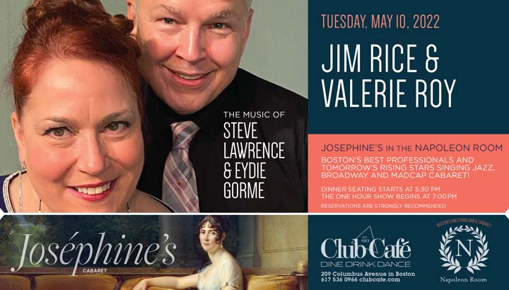 JOSEPHINE’S in the NAPOLEON ROOM – Boston’s best professionals and tomorrow’s rising stars singing JAZZ, BROADWAY & MADCAP CABARET! Dinner seating starts at 5:30 pm and the one hour show begins at 7:00 pm. RESERVATIONS strongly recommended.