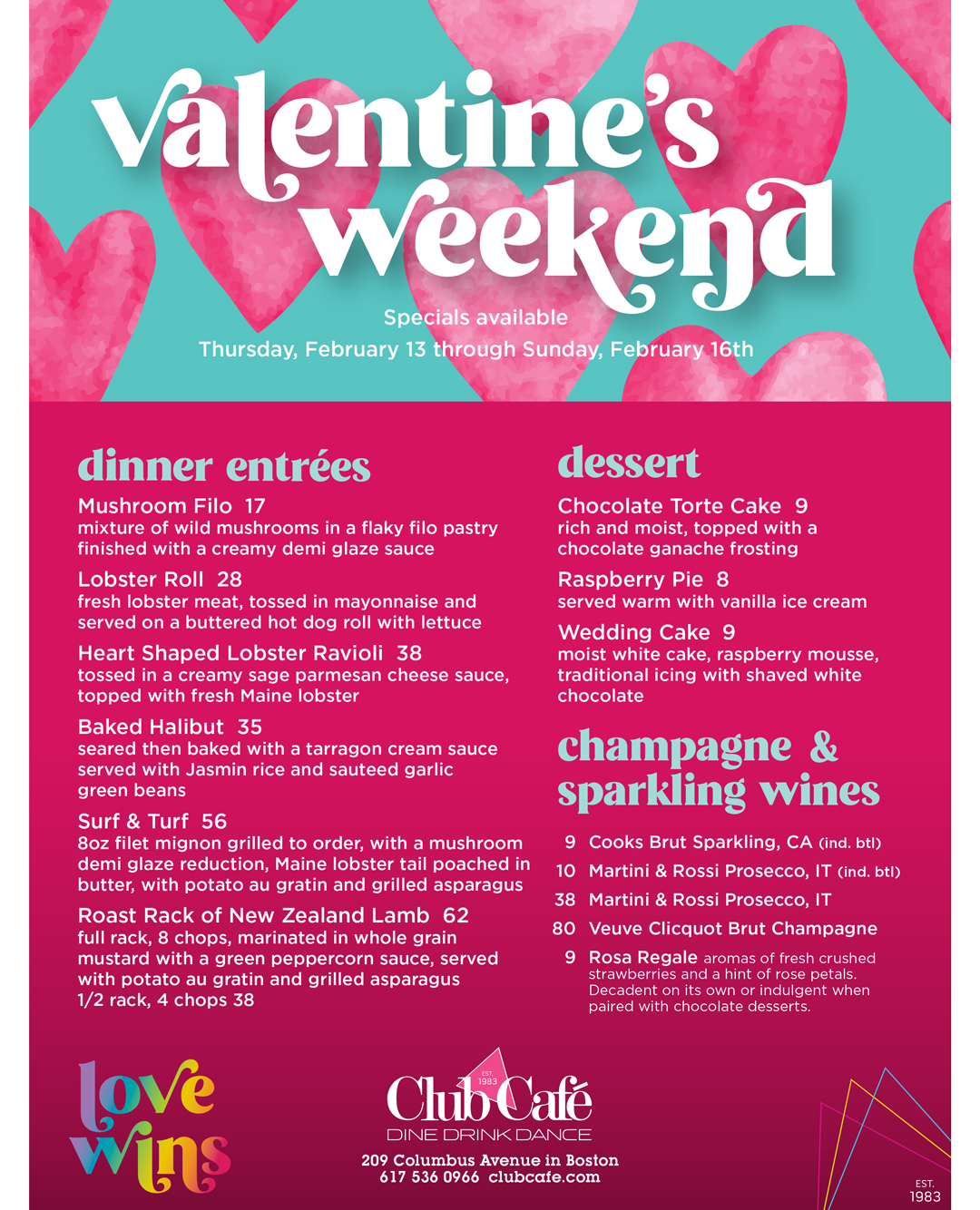 VALENTINE’S DINNER SPECIALS will be available Thursday, February 13th through Sunday, February 16th.