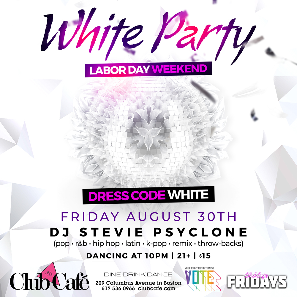 Join us at Club Café as we kick off the Labor Day weekend with a WHITE PARTY. DJ STEVIE PSYCLONE spins pop * r&b * latin * k-pop * remix * throw-backs