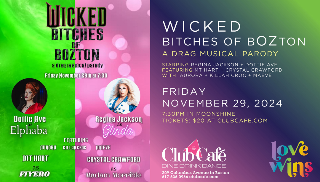 Regina Jackson and Dottie Ave are proud to present Wicked Bitches of bOZton, a musical drag parody, based off the hit musical and upcoming movie. So much happened before Dorothy dropped in, seriously, so much tea. Featuring an all star cast of MT Hart as Fiyero, Crystal Crawford as Madame Morrible, and a talented ensemble of Aurora, Killah Croc, and Maeve.