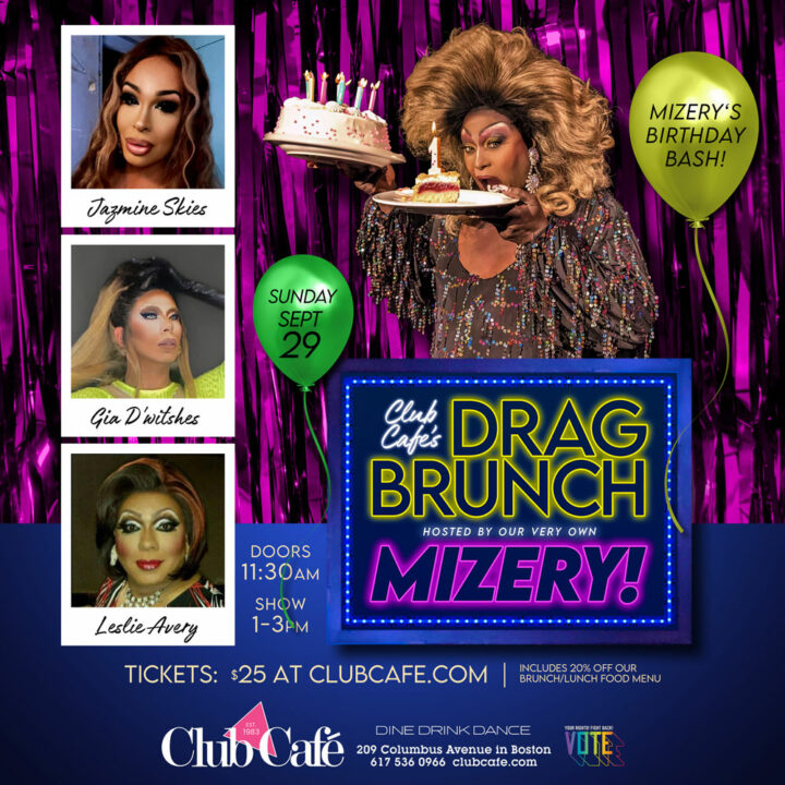 MIZERY’S BIRTHDAY BASH DRAG BRUNCH Hosted by MIZERY! featuring very special guests JAZMINE SKIES, GIA D’WITSHES, , and LESLIE AVERY . $25 includes 20% off our Brunch / Lunch food menu. Doors at 11:30am, show 1-3pm. 21+