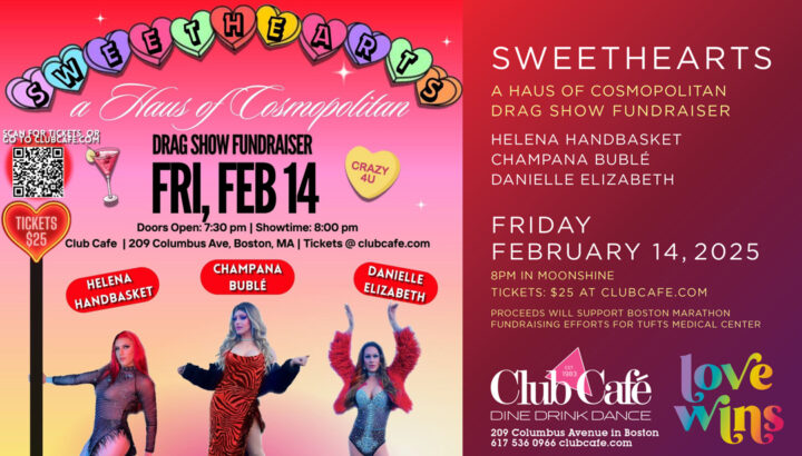 Come celebrate your Valentine’s Day with the lovely ladies of the Haus of Cosmopolitan! These divas are ready to serve you a show filled with looks, stunts, and loads of camp. Bring your partner, latest Bumble date, or one night night stand to this Valentine’s Day extravaganza as we shower these local queens with love and dollar bills. Ticket proceeds will support fundraising for the Boston Marathon 2025 on behalf of Tufts Medical Center! Email Colin with any questions: colin.burnett22@gmail.com