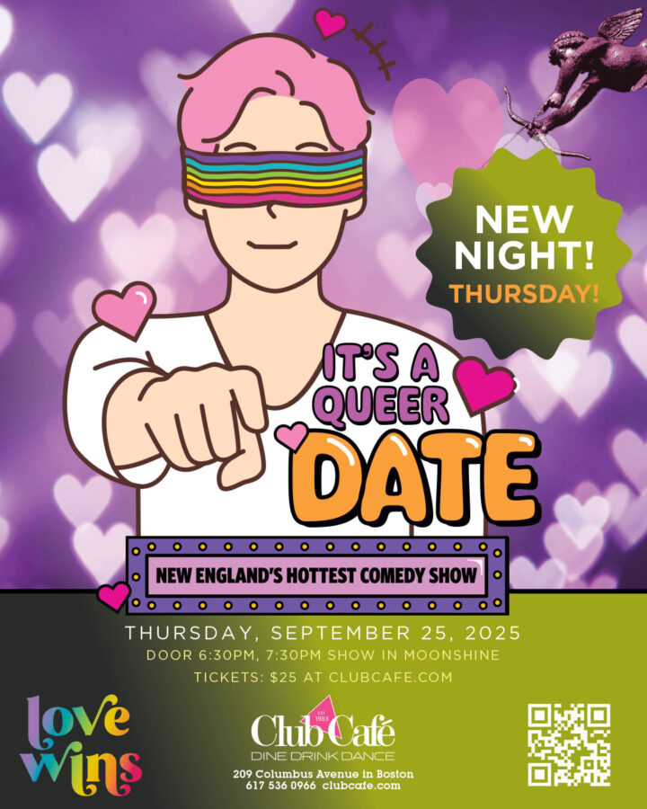 “It’s A Queer Date” is New England’s hottest comedy dating show where four singles take the stage blindfolded and let their charms do the seducing, while the audience throws in deep and spicy questions. Get ready for a night where laughter, mystery, and unexpected sparks collide.