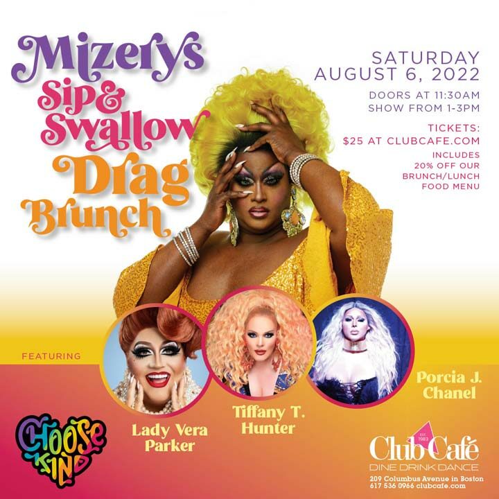 MIZERY’S SIP & SWALLOW DRAG BRUNCH featuring LADY VERA PARKER, TIFFANY T. HUNTER, PORCIA J. CHANEL. $25 includes 20% off our Brunch / Lunch food menu. Doors at 11:30am, show 1-3pm.