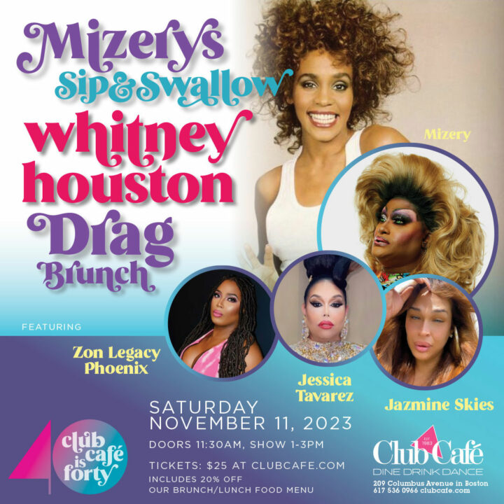 MIZERY’S SIP & SWALLOW WHITNEY DRAG BRUNCH featuring Jessica Tavarez, Zon Legacy Phoenix and Jasmine Skies. $25 includes 20% off our Brunch / Lunch food menu. Doors at 11:30am, show 1-3pm.