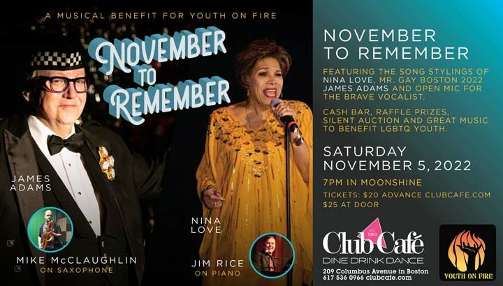 NOVEMBER TO REMEMBER is a musical benefit for Youth On Fire featuring the song stylings of NINA LOVE and JAMES ADAMS with Jim Rice on piano and Mike McClaughlin on Saxophone. Cash Bar, Raffle Prizes, silent auction and great music to benefit LGBTQ youth. Tickets $25 at the door