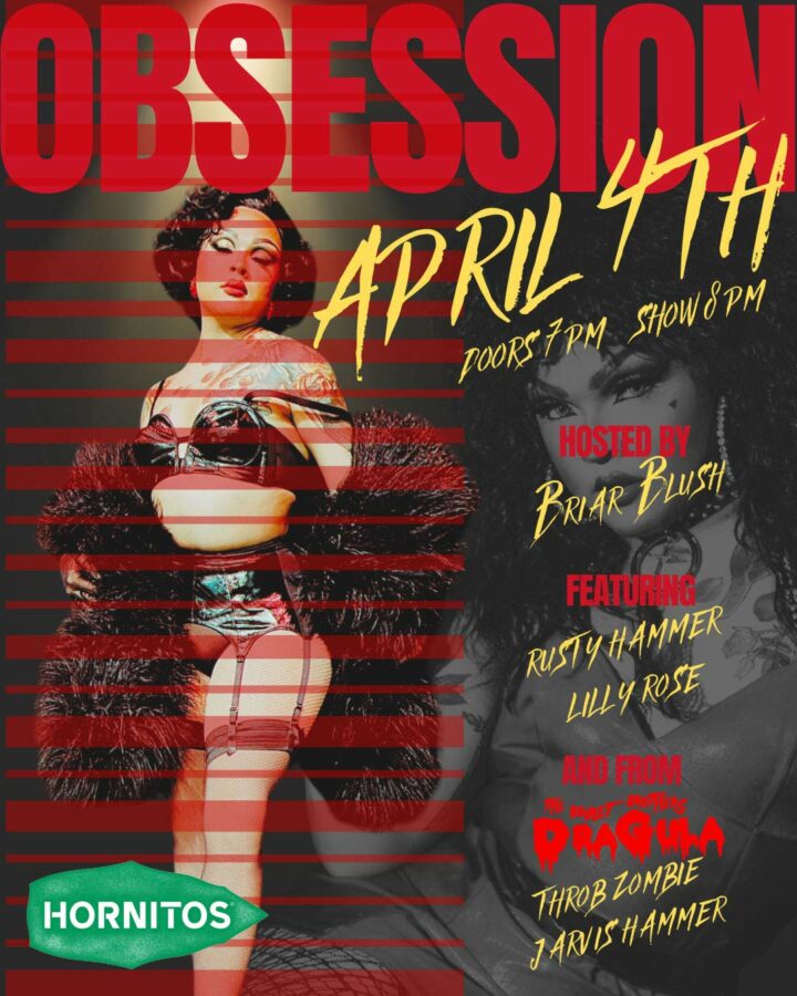 “OBSESSION”, the newest cabaret in Boston, is your most recent fixation and is sure to satisfy all of your inner cravings. This breathtaking evening of drag combines macabre glamour, dark seduction, and more. The cast gives a taste of Boston’s most well-known stars, including: the ever so dashing Rusty Hammer, the city’s darling Lilly Rose Valore, and, as seen on The Boulet Brothers’ Dragula; demon daddy Throb Zombie, and an extra-special visitor who traveled from Atlanta (and the afterlife) to attend, Jarvis Hammer. Hosted by the intoxicating Briar Blush
