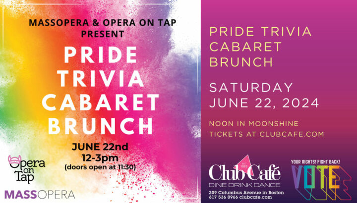 MassOpera and Opera On Tap are thrilled to present the first Pride Trivia Cabaret Brunch since 2019! In celebration of Pride Month, we are partnering with Club Café to combine the forces of their delicious Sunday brunch and our boozey Trivia Cabaret for a Pride event unlike any other! Eat, drink, trivia, and listen to the best singers in Boston.