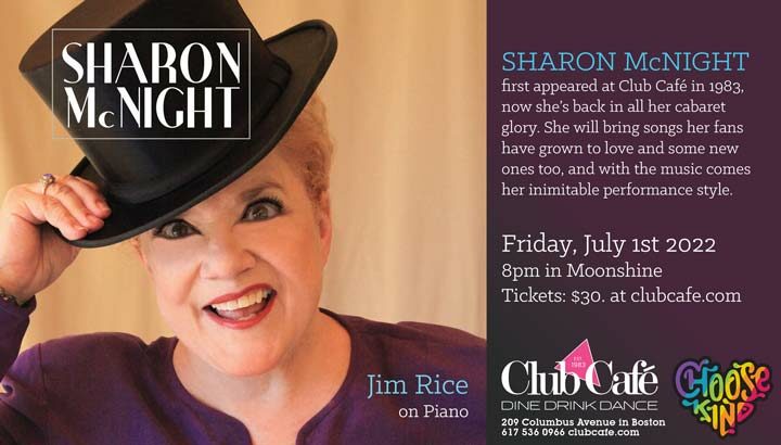 SHARON MCNIGHT first appeared at Club Café in 1983, now she’s back in all her cabaret glory. She will bring songs her fans have grown to love and some new ones too, and with the music comes her inimitable performance style. Jim Rice on piano.