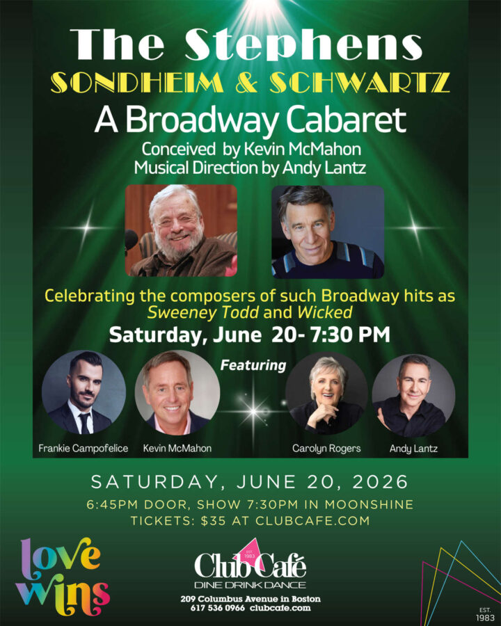 Two of Broadway’s most popular composers, Stephen Sondheim (Into the Woods, Sweeney Todd, A Little Night Music) and Stephen Schwartz (Wicked, Pippin, Godspell), are celebrated in a unique cabaret that comes to Club Café after a sold-out engagement on the Outer Cape. Club Café favorites FRANKIE CAMPOFELICE and ANDY LANTZ are joined by CAROLYN ROGERS (Provincetown‘s Great Music on Sundays at 5:00) and KEVIN MCMAHON (Broadway’s Wicked, Bright Star, and City of Angels) in an evening featuring favorites from Wicked, Into the Woods, Pippin, and Company, along with rarely performed gems from Passion, The Baker’s Wife, Hot Spot, and Children of Eden.