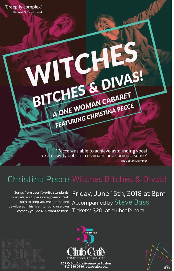 Singing actress Christina Pecce, performer in Jesus Christ Superstar (Regent’s Park Open Air Theatre London’s Production at Chicago Lyric), makes her Club Café Boston debut in Witches, Bitches, and Divas! Songs from your favorite standards, musicals, and operas are given a fresh spin to keep you enchanted and bewildered. Featuring music from Annie to Women On The Verge, from Sweeney Todd to Carmen, this is a night of cross-over comedy you do NOT want to miss. Celebrate iconic roles, both onstage and off, but beware… this program is sure to put a spell on you!