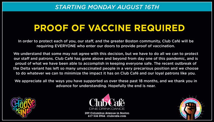 But due to the rising numbers of the Covid Delta variant, the high number of break-through infections happening all around us and out of an abundance of caution, Club Café will begin to require PROOF of Vaccine FROM all that ENTER our doors.